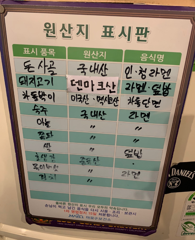 대부분 재료는 국내산이고 일부 덴마크산과 미국산 멕시코산 중국산 재료들을 사용하고 있습니다.