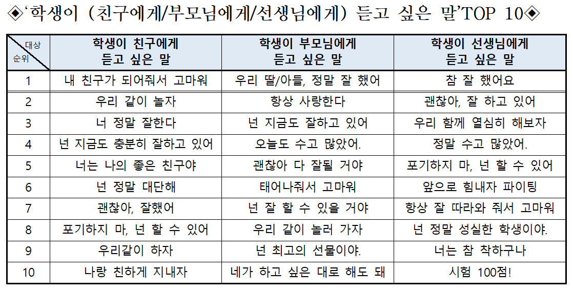 서울시교육청은 언어문화 개선과 관계회복을 위한 예방교육의 일환으로 공모전을 시행하여, 아래의 3가지 주제에 대해서 응모작을 받은 후 빈도순으로, 학생이 듣고 싶은 말 Top10 을 선정하였습니다.