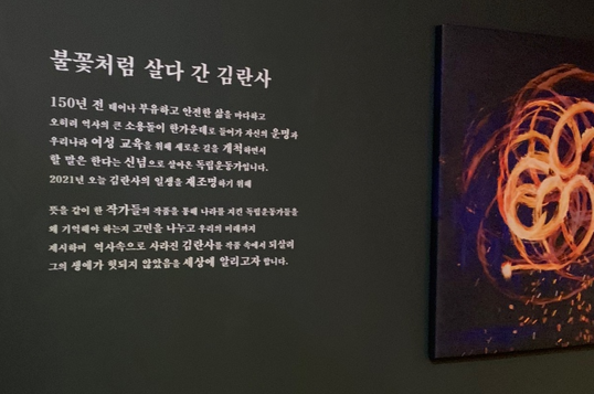 2021년 오늘 김란사의 일생을 재조명 하기 위해 뜻을 같이 한 작가들의 작품을 통해 나라를 지킨 독립운동가들을 왜 기억해야 하는지 고민을 나누고 우리의 미래까지 제시하며 역사속으로 사라진 김란사를 작품 속에서 되살려 그의 생애가 헛되지 않았음을 세상에 알리고자 합니다.