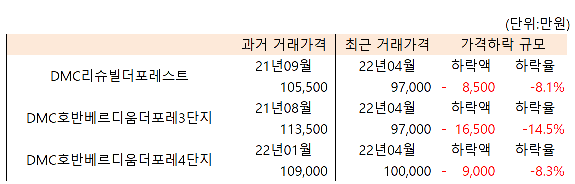 또한, 인근 단지인 경기도 고양시 덕양구 향동동 'DMC호반베르디움더포레4단지'(전용84㎡)역시 지난 4월 10억원에 거래되었는데, 이는 22년1월 거래가격인 10억9천만원 대비 9천만원 떨어진 가격입니다.