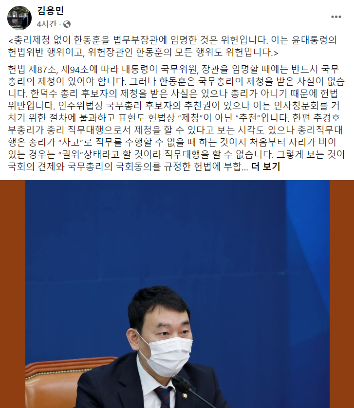 민주당 김용민 의원은 5월19일 페이스북을 통해, '총리제청 없이 한동훈을 법무부장관에 임명한 것은 위헌' 이라고 밝혔습니다. 김의원은 이어, 현 상황을 '윤대통령의 헌법위반 행위이고, 위헌장관인 한동훈의 모든 행위도 위헌' 이라고 강조했습니다.