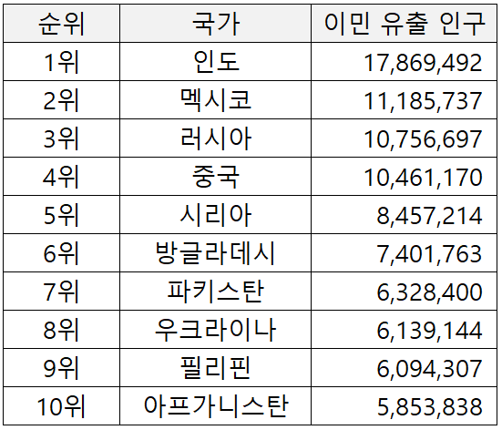 아래는 국가별 이민자의 유출이 가장 많은 국가 Top10 입니다.(2020년 기준)