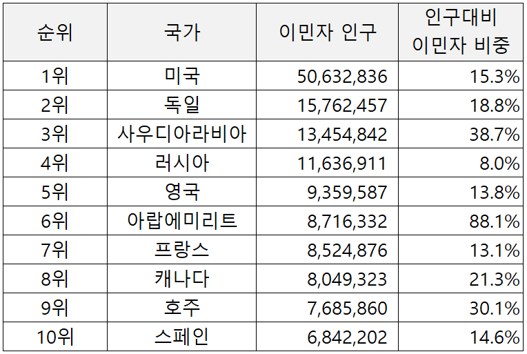 또한 우리가 흔히 아는 선진국인 영국, 독일, 프랑스 등의 국가들도 이민자 비율이 높게 나타나고 있습니다.