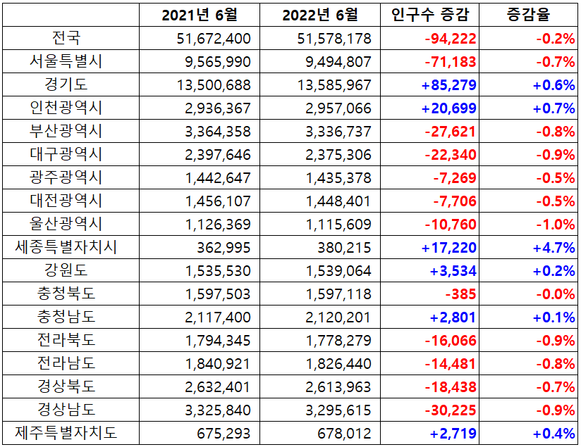 대한민국 광역시별 인구 증감 현황은 아래와 같습니다.