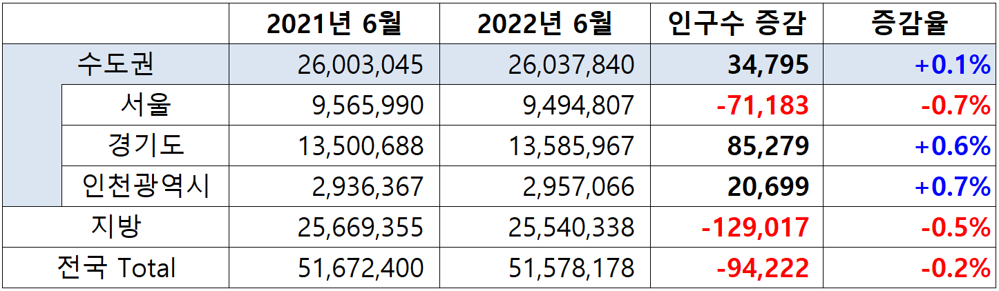 대한 민국의 전체 인구는 최근 1년 사이 94,222 명이 감소했습니다. 그렇다면, 지역별 인구 증감 현황은 어떨까요? 먼저 수도권과 지방인구를 비교해서 살펴보면 아래와 같습니다.
