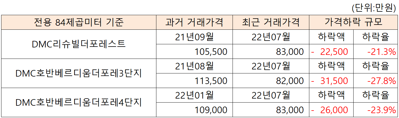 인근 덕양구 향동동 'DMC호반베르디움더포레4단지'(전용84㎡)역시 지난 7월 8억3천만원에 거래되었는데, 이는 22년1월 거래가격인 10억9천만원 대비 2억6천만원 하락한 가격입니다.