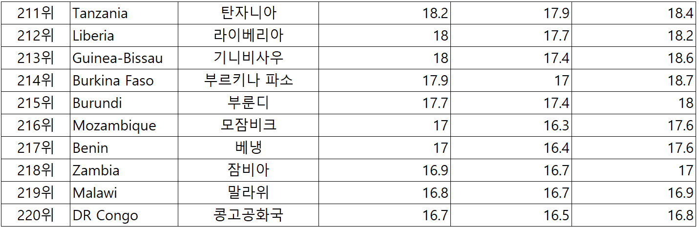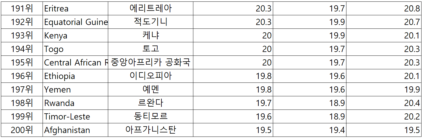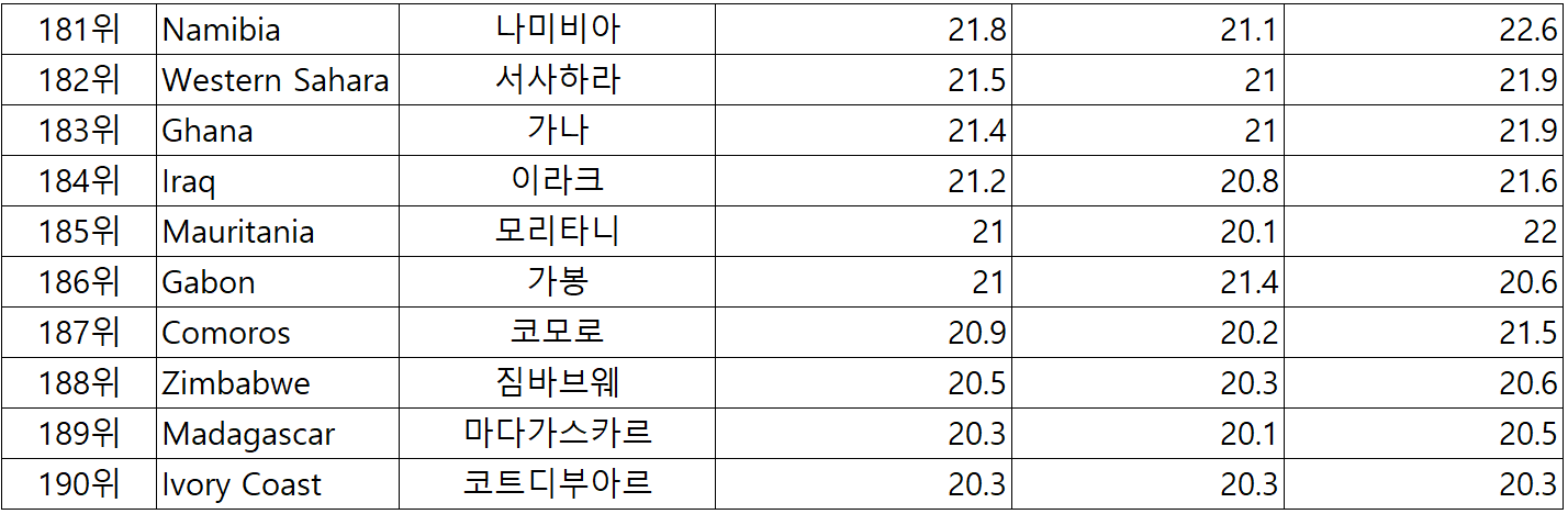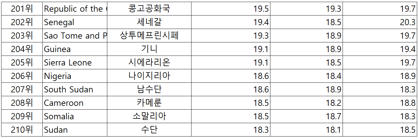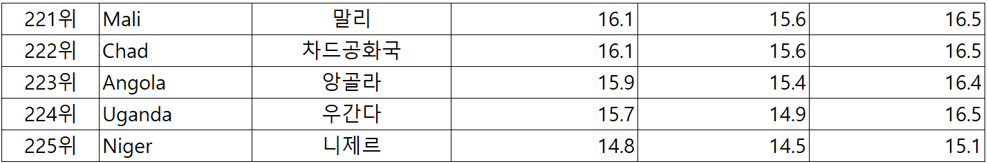 아래는 전세계 225개국 국가별 중간값 순위 입니다.