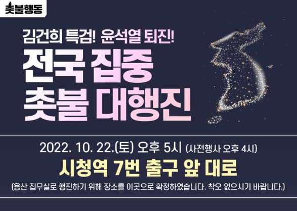 10월 22일(토) 서울 청계광장 앞 세종대로에서 '윤석열 퇴진' 과 '김건희 특검'을 주장하는 촛불 대행진이 있을 예정입니다. 연일 계속되는 윤석열 정부의 실정과 민생 외면에, 사회 각계각층의 분노와 우려가 쏟아지고 있는 가운데, 집회 규모가 얼마나 더 확산될지 귀추가 주목됩니다. 해당 집회는 지난주(10월1일) 까지 총 8회에 걸쳐 진행되고 있으며, 최근에는 유력 언론사들에서도 관심을 보이고 있습니다.