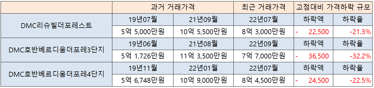 가장 최근인 22년 9월과 7월에 거래가 이루어진 주요 3개단지 실거래가를 살펴본 결과, 고점 대비 3억6천만원 하락한 7억원대 실거래가 아파트가 등장했습니다. 해당단지는 DMC호반베르디움더포레 3단지 입니다.