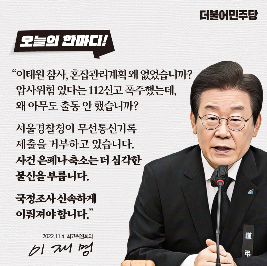 더불어 민주당 이재명 대표는, 11월4일 금요일 오전에 열린 최고위원회의 모두발언에서 이태원참사 관련하여 정확한 진실규명을 촉구했습니다. 이재명 후보는 관련하여 정부의 대응이 적절했는지에 대한 다양한 문제제기와 함께, 정확한 원인을 밝히기 위한 국정조사가 이루어져야 한다고 주장했습니다.