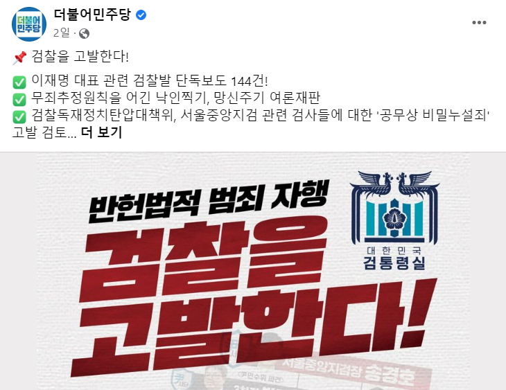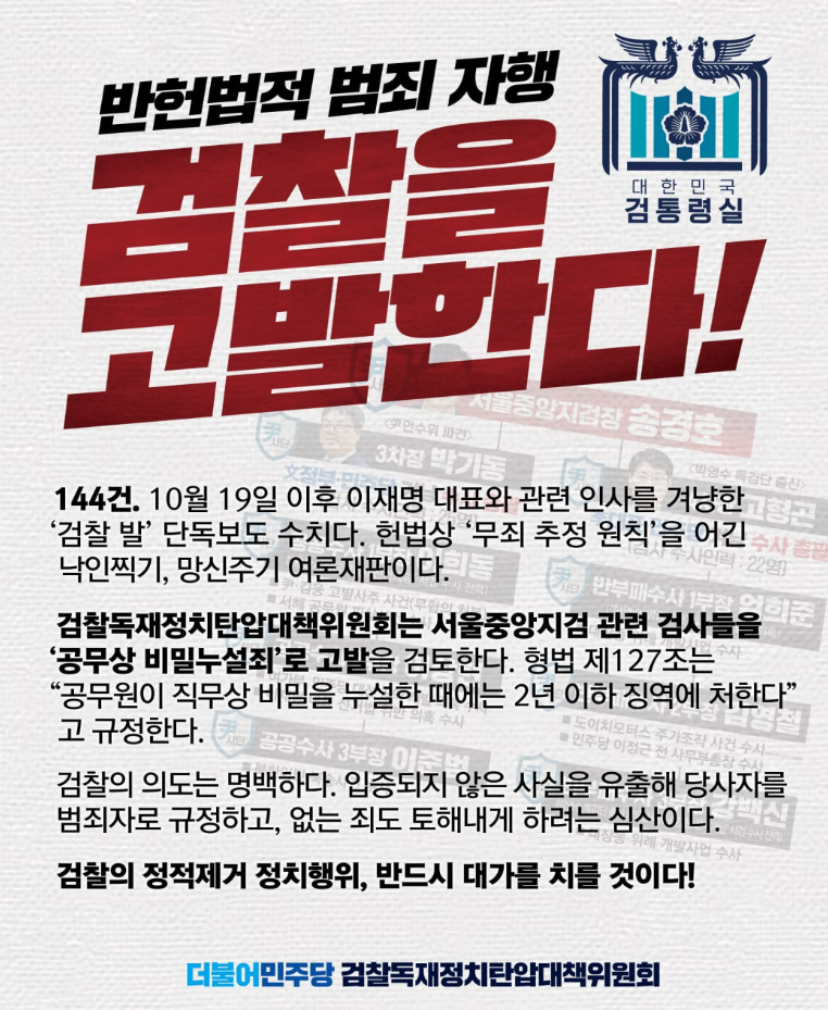 더불어민주당은 11월25일 당의 공식 페이스북 계정에 검찰의 행태를 비판하는 게시물을 게제했습니다. 해당 글에서 민주당은, 검찰이 무죄추정원칙을 어기고 낙인찍기, 망신주기 여론재판을 하고 있다고 비판했습니다. 실제로 10월19일 이후 이재명 대표와 관련인사를 겨냥한 '검찰발 단독보도 건수가 144회에 이른다고 민주당은 전했습니다.