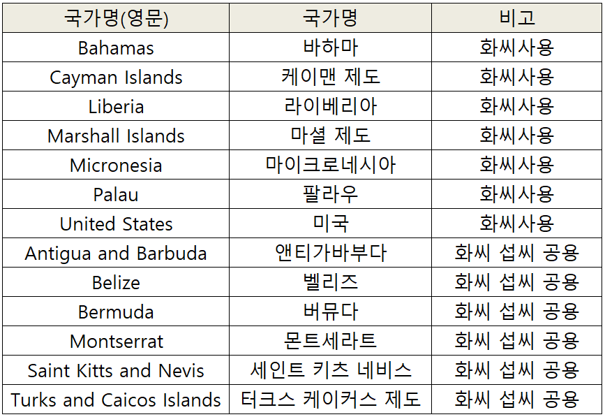 현재 지구상의 많은 국가들은 섭씨(°C) 단위를 주로 사용하고 있으며, 화씨(°F)를 사용하는 국가는 많지 않습니다. 아래는 화씨 단위를 사용하는 주요 국가 목록 입니다.