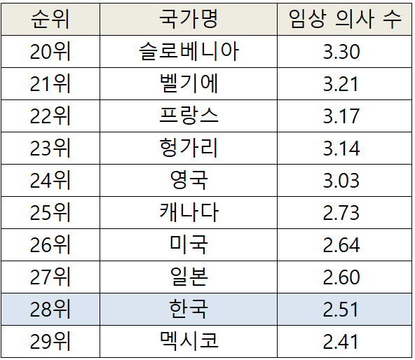우리나라의 임상의사수(한의사 포함)는 인구 1,000명 당 2.5명으로 OECD 평균인 3.7명에 크게 하회하고 있습니다. 또한, 국가별 순위에서도 OECD 국가들 중 꼴찌에서 두번째 순위를 기록했습니다. 인구대비 의사 숫자가 다른국가에 비해 현저히 적은 수준입니다. 이는, 우리나라 의료분야의 발전을 위해, 전문인력의 질적인 측면 뿐만 아니라, 양적인 증가에 대한 필요성이 충분히 요구될 수 있는 수준입니다.