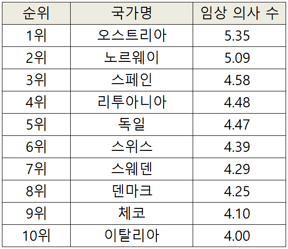 아래는 OECD 주요 국가들의 인구당 의사 수 순위 입니다.(1,000명당 임상의사 수 기준)