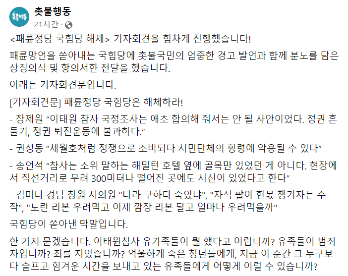촛불행동은 최근 발생한 10.29 이태원 참사 관련하여, 국민의힘 국회의원 등의 발언을 인용하며 국민의힘을 '패륜정당'으로 규정하고 강하게 비판했습니다. 촛불행동은 기자회견문을 통해, "유족들 앞에 무릎꿇고 용서를 빌어도 모자란 참사책임자 국힘당이 참사 피해자인 유족들에게 막말을 내뱉고 윽박지른다" 라고 비판했습니다. 이어서, "국힘당은 인간으로서 지켜야할 최소한의 도리도 내팽개친 패륜정당" 이라고 강한 비판을 이어갔습니다.