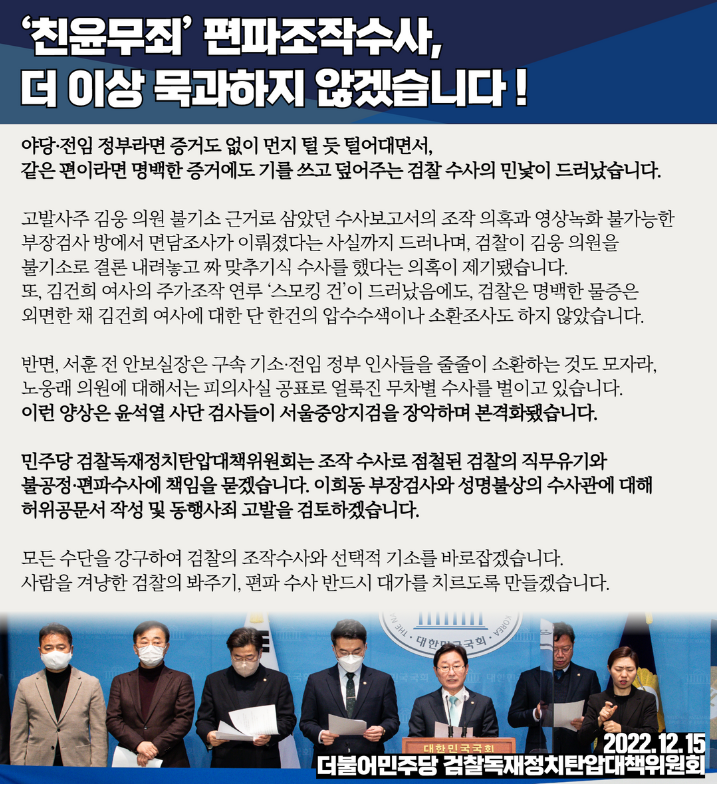 민주당은 2022년 12월15일 당내 게시판을 통해, 윤석열 정부의 '편파조작수사, 더 이상 묵과하지 않겠습니다!' 라고 선언했습니다. 해당글은 더불어민주당 검찰독재정치탄압대책위원회 명의로 게시되었으며, 해당 글에는 짜맞추기 검찰수사에 대한 의혹 제기와 검찰의 직무유기 및 불공정 편파수사에 대한 책임을 묻겠다는 내용이 포함되어 있습니다.
