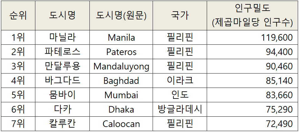 세계 인구밀도 상위 Top7 도시(2022년 기준) 본문