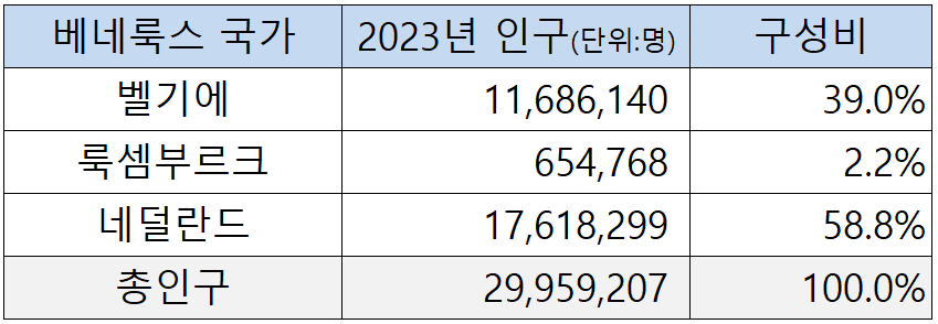 베네룩스 3국의 총인구는 약 3천만명 수준이며, 가장 많은 비중을 차지하는 나라는 네델란드로 58.8% 의 인구 구성비를 차지하고 있습니다.