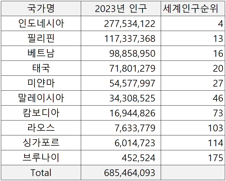 아세안(ASEAN) 개요 및 가입국 인구 현황(2023) 에 대해 알아보겠습니다.