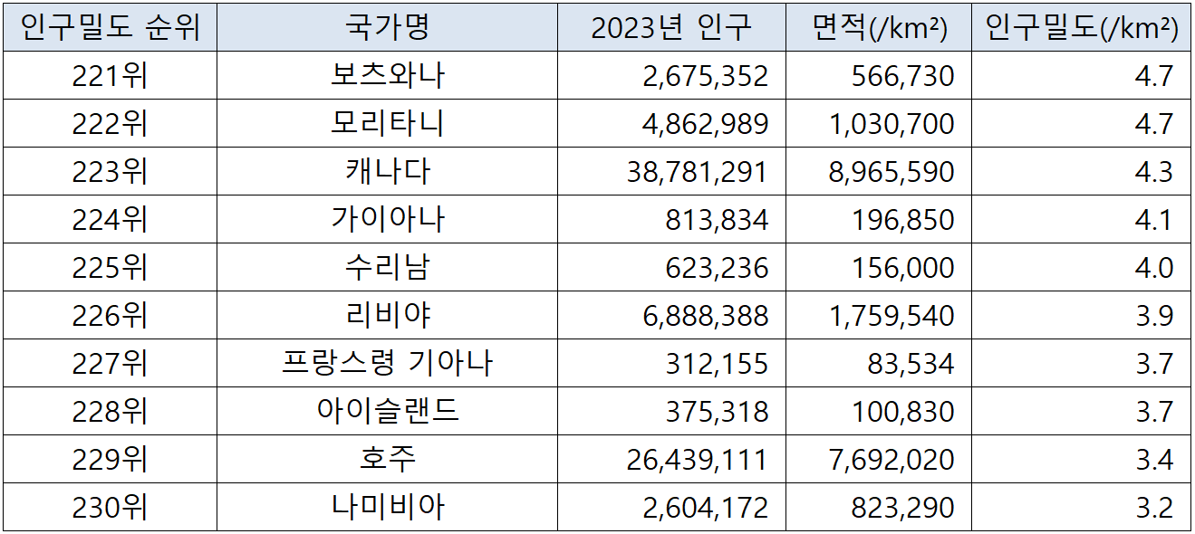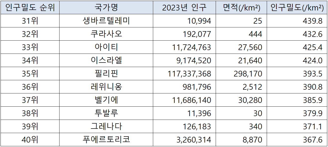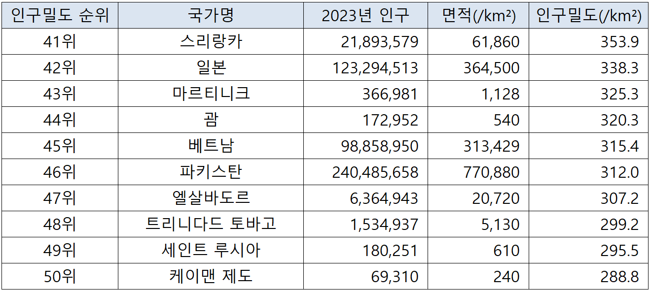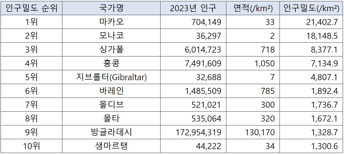 국가별 인구밀도 순위(2023년 기준) 본문