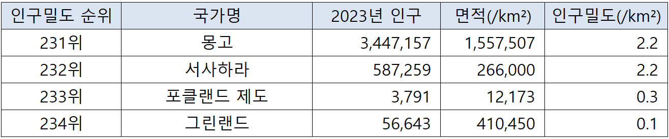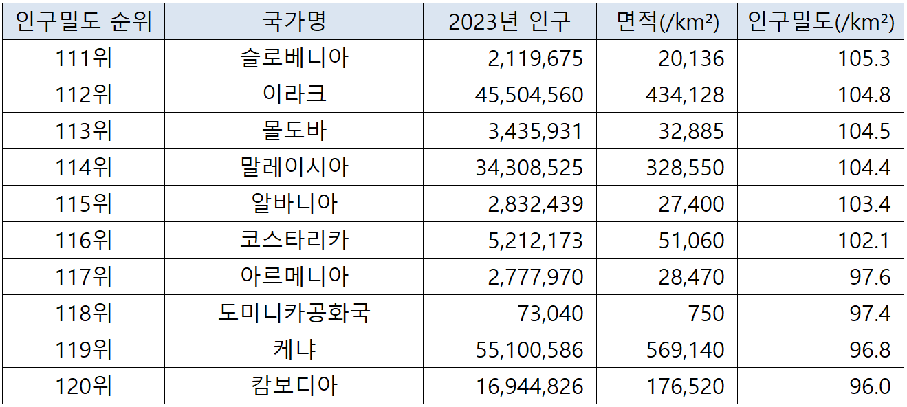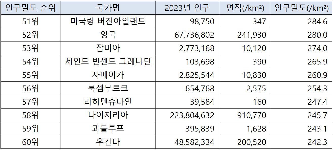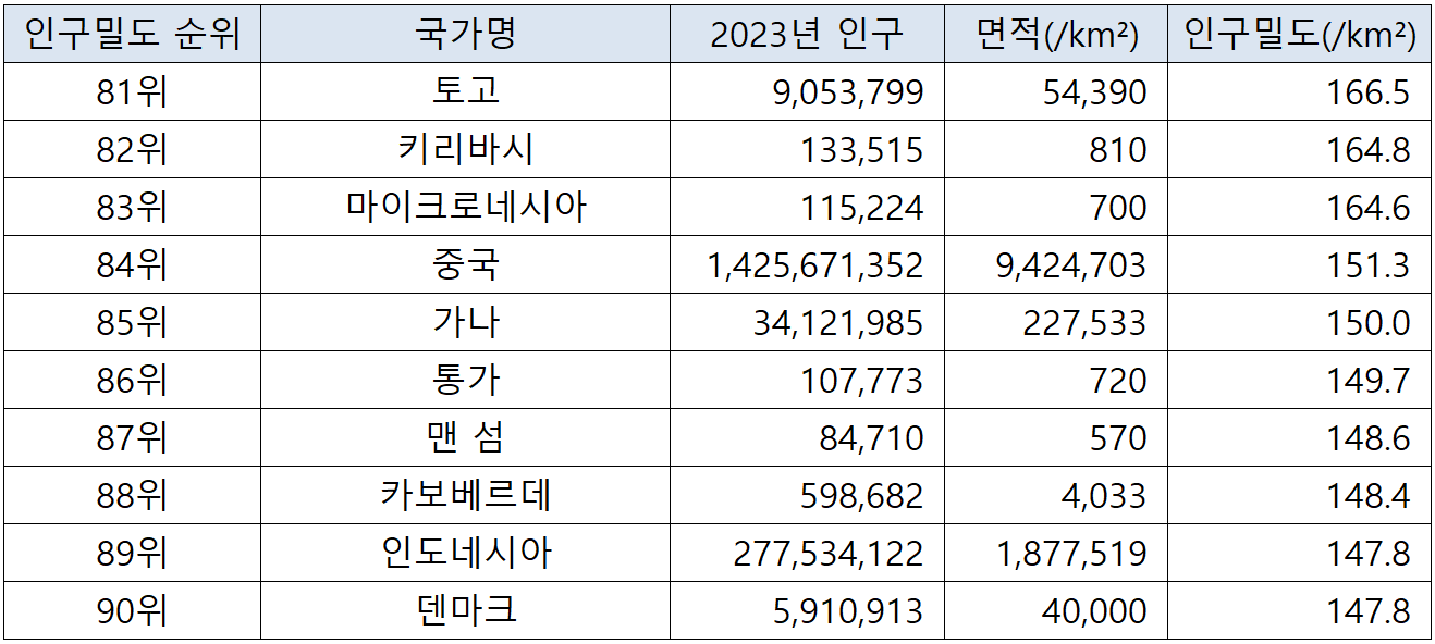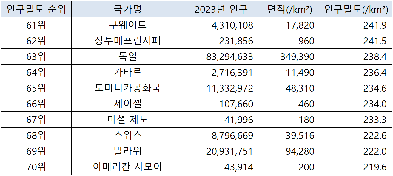 국가별 인구밀도 순위(2023년 기준) 본문