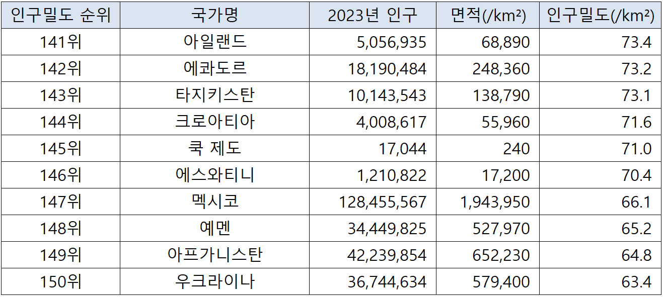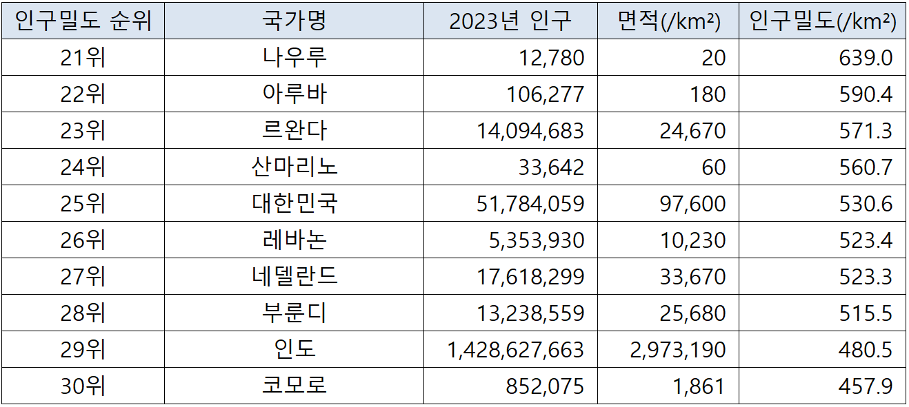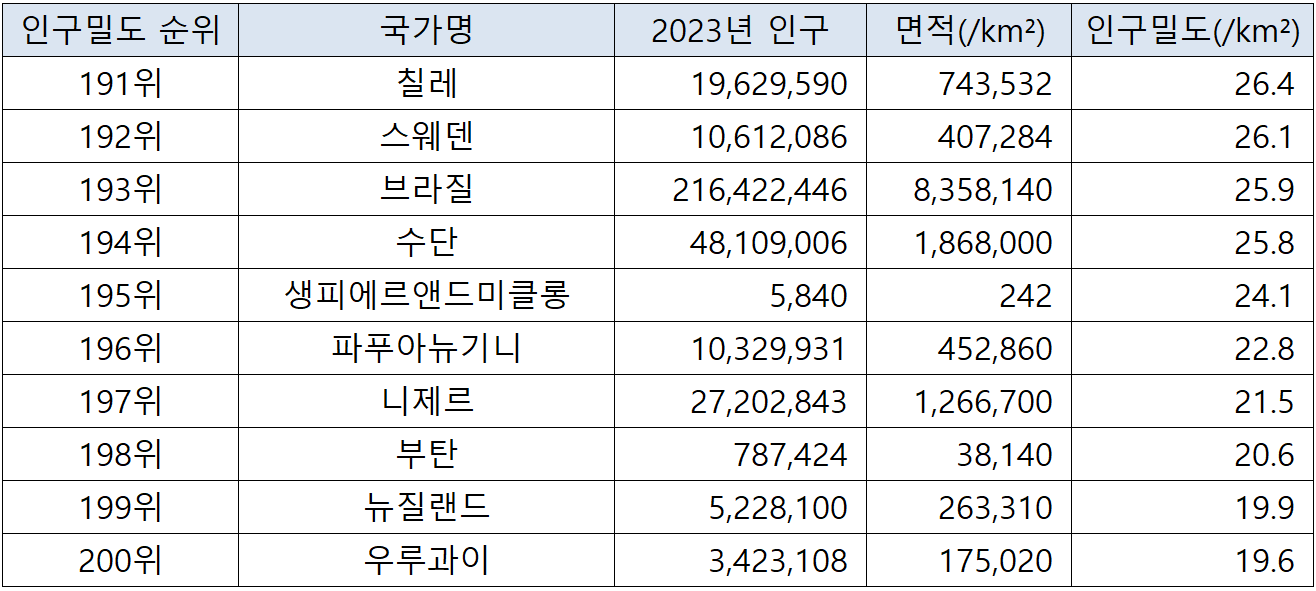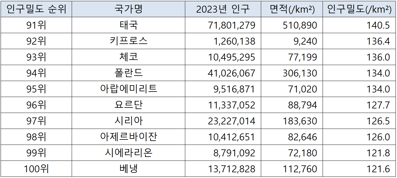 (자료에 사용되는 표의 인구밀도는 항목 기준은 '제곱킬로미터당 평균 인구수' 입니다. 아울러, 영토면적은 토지면적을 기준으로 하여, 다른 유사한 주제의 통계자료와 차이가 있을 수 있습니다. 출처 : worldpopulationreview.com)