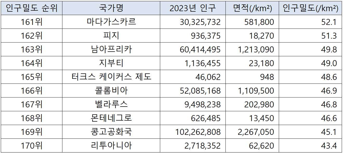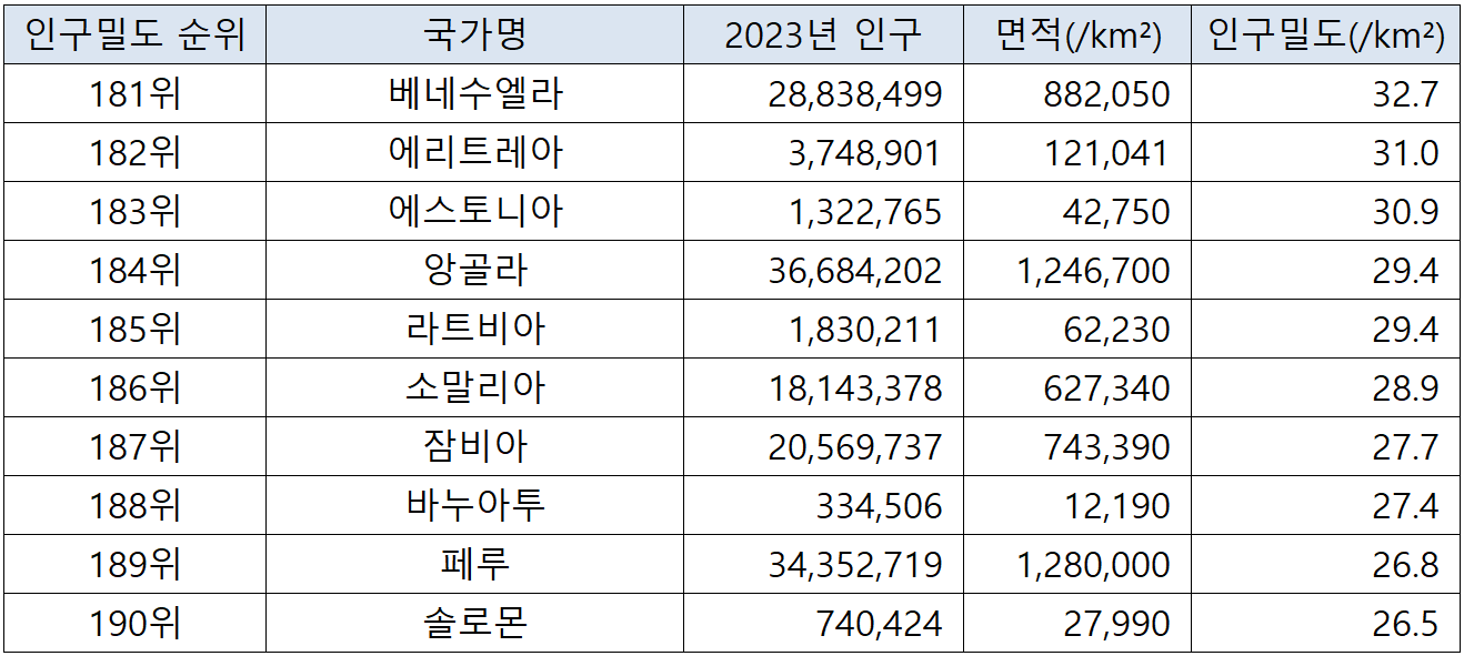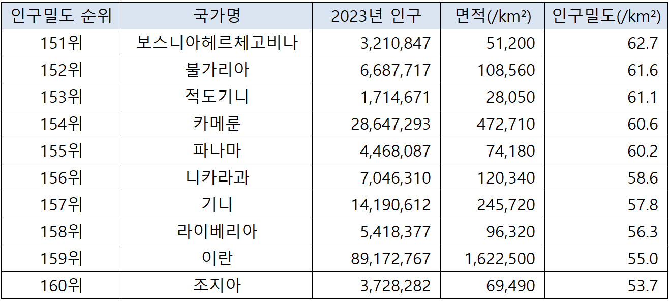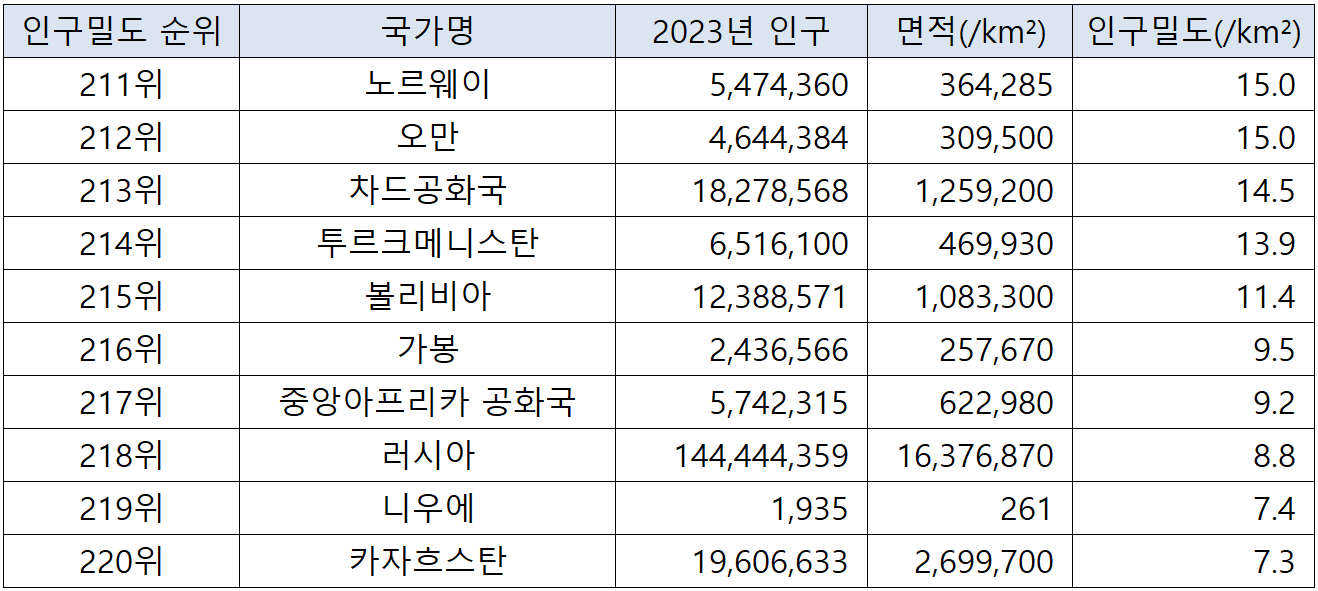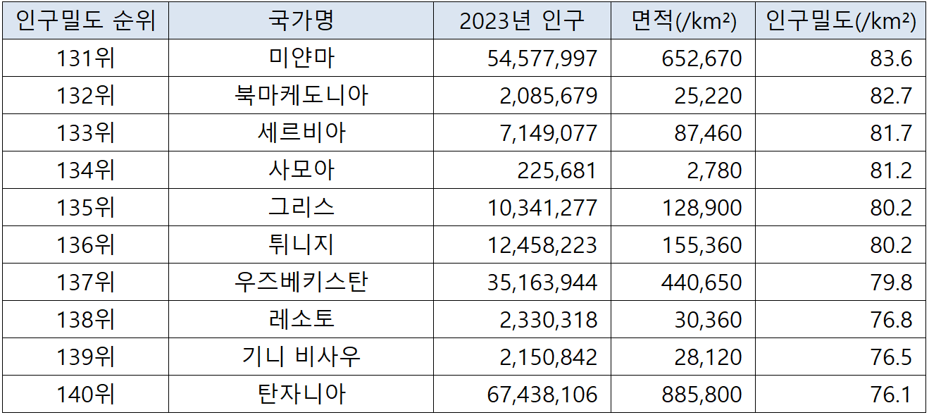 (자료에 사용되는 표의 인구밀도는 항목 기준은 '제곱킬로미터당 평균 인구수' 입니다. 아울러, 영토면적은 토지면적을 기준으로 하여, 다른 유사한 주제의 통계자료와 차이가 있을 수 있습니다. 출처 : worldpopulationreview.com)
