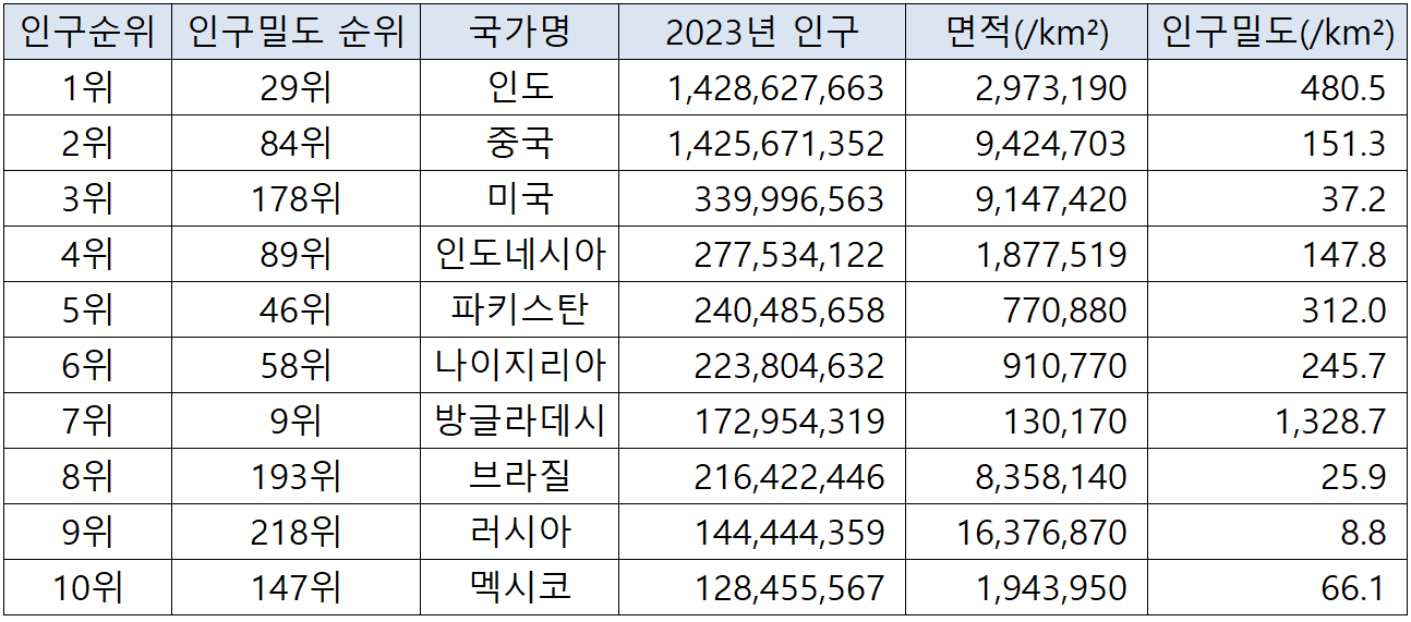상대적으로 인구가 많은 인구 대국들의 인구밀도는 어느정도 수준인지 알아보겠습니다. 2023년 인구 수 기준 상위 10개 국가들의 인구밀도 현황입니다. 2023년 세계 인구 순위 1위가 될 것으로 전망(UN보고서 기준)되는 인도는 인구밀도 순위에서는 29위 수준입니다. 인구가 많은 중국과 미국 역시 인구밀도는 상당히 낮은 편에 속합니다. 즉, 인구 대국들의 인구밀도는 그리 높은 편이 아닙니다.
