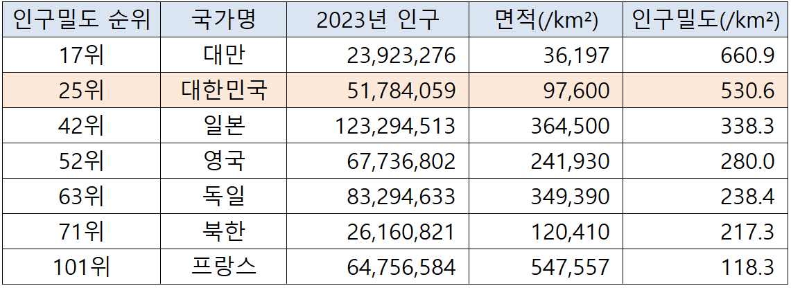우리나라인 대한민국의 인구밀도는 어느 수준일까요? 대한민국의 인구밀도는 세계25위로 상위권에 속합니다. 우리나라 주변국 혹은 주요 선진국들과 비교 할 때에도 우리나라의 인구밀도는 높은 수준 입니다.