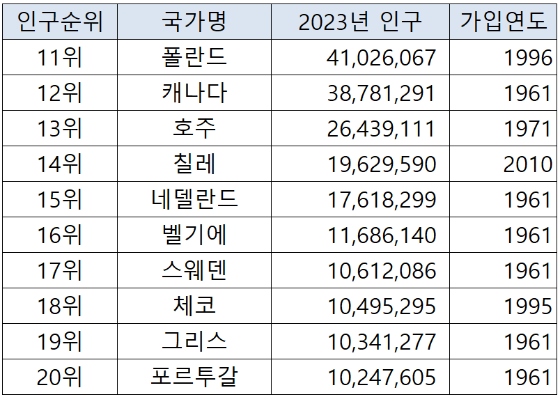 OECD는 총 36개 회원국을 보유 하고 있으며, 2023년 기준으로 가입국 전체 인구수는 약 13억명에 달합니다. 아래는 OECD 회원국별 인구 현황입니다.