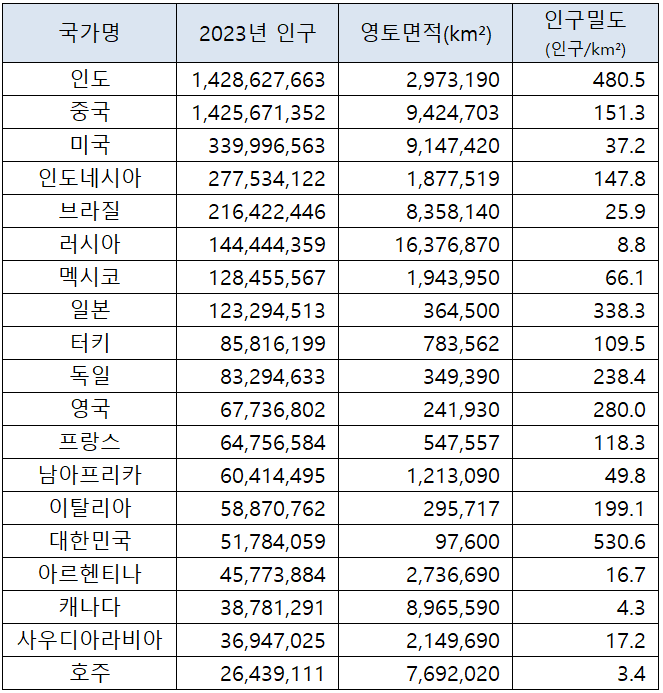 3. G20 국가별 인구(2023년 기준)