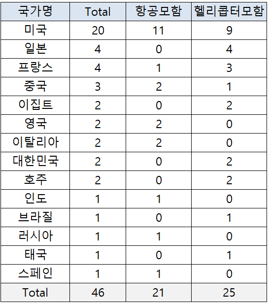 현재(2021년 기준) 전세계적으로 약 46대의 항공모함(헬기항공모함 포함)이 운영 되고 있습니다. 세계적으로 가장 많은 항공모함을 보유하고 있는 나라는 미국으로 총 20대를 보유하고 있습니다. 이는 전세계 항공모함중 약 절반정도를 차지하는 수준입니다. 우리나라의 경우, 총 2대(독도함과 마라도함) 경항공모함을 보유하고 있습니다.