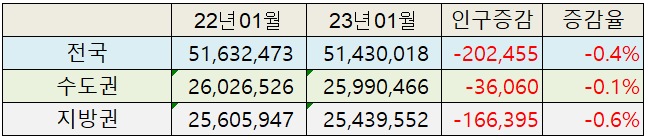 대한민국의 전체적 인구 감소 추세속에, 수도권과 지방권 모두 총인구는 감소했습니다. 그러나, 상대적으로 지방권의 인구감소가 훨씬 빠르게 이루어지고 있습니다. 최근 1년 수도권의 인구가 36,060명 감소한 반면, 지방권의 인구는 166,395명 감소했습니다. 지방권의 경우 인구소멸 이라는 말이 무색할 만큼 많은 인구가 감소하고 있습니다.