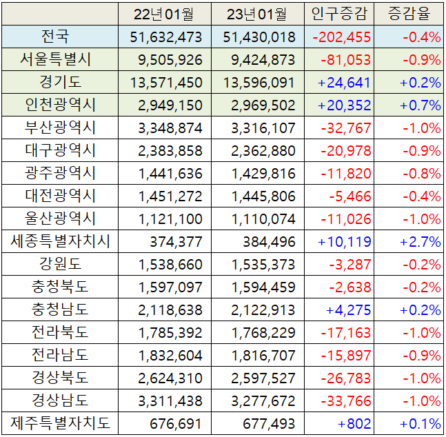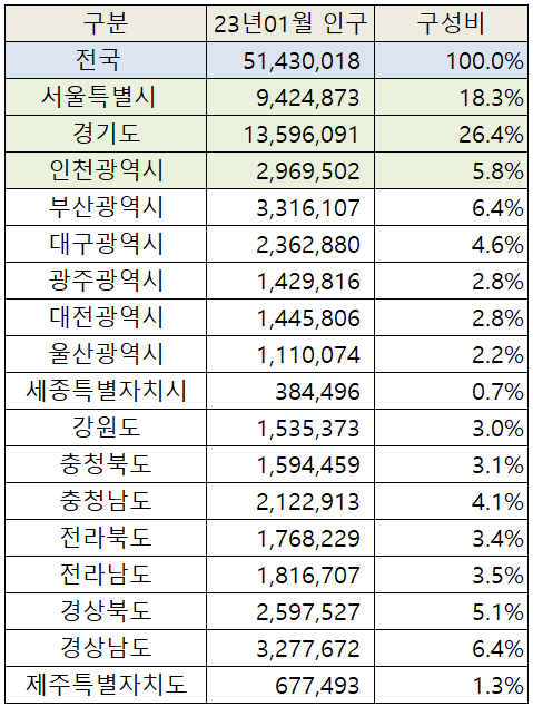 2023년 1월 기준 우리나라 시도별 인구 현황을 알아보겠습니다. 본 글에서 사용한 통계자료는 행정안전부 인구통계 데이터를 기반으로 작성되었습니다. 글의 구성은 아래와 같습니다.