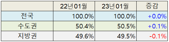 그 결과로, 총인구 대비 수도권의 인구 구성비는 증가했습니다. 2023년의 총인구 대비 수도권 인구 구성비는 전년대비 +0.1% 증가한 50.5% 를 기록하고 있습니다. 수도권의 인구 편중은 오히려 심해진 것입니다.