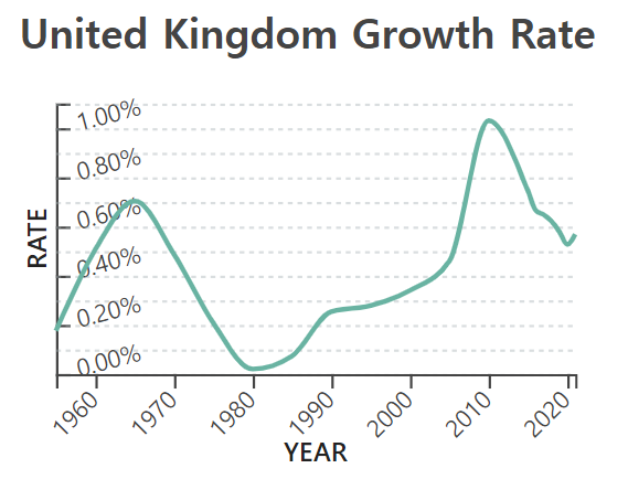 영국의 인구는 연간 약 0.6% 정도씩 증가하고 있어, 상대적으로 느린 증가세를 보여주고 있습니다. 이는 인구증가율 국가 순위 159위에 해당하는 속도 입니다. 영국의 출산율은 1.8명 입니다. 이는 현재 인구 유지를 위한 출산율인 2.1명에 못미치는 수치 이지만, 해외 이민자의 유입이 많아, 인구 전체는 순증하고 있습니다.