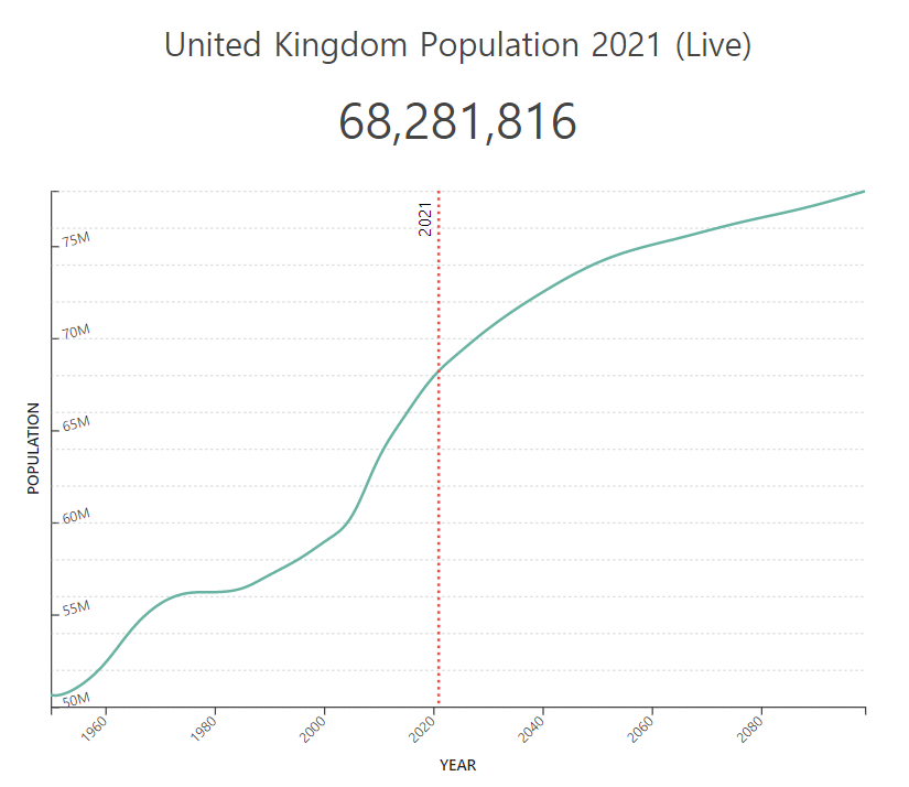 영국의 인구는 꾸준하게 증가하고 있어, 2060년에는 7천5백만명을 넘어설 것으로 예측됩니다. 또한, 현재의 인구증가 추세는 2099년 까지도 지속될 것으로 전망되며, 이 때 영국 인구는 7천8백만명에 이를 것으로 추산됩니다.