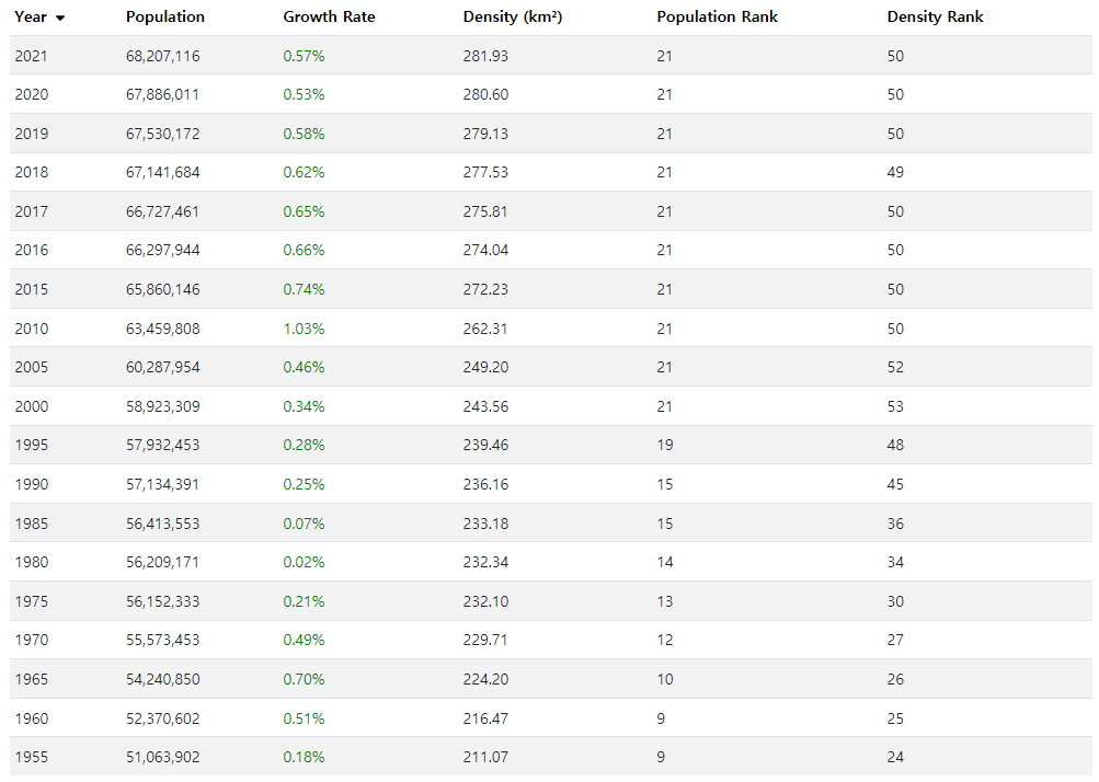 아래는 1955년 부터 2021년 까지의 주요 연도별 인구현황 입니다. 1955년과 비교할때 현재 2021년의 인구는 약 1천7백만명 정도 증가하였습니다.