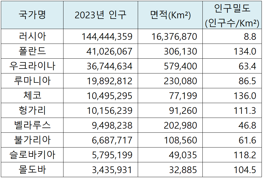 동유럽 국가 인구, 영토면적, 인구밀도(2023년) 본문