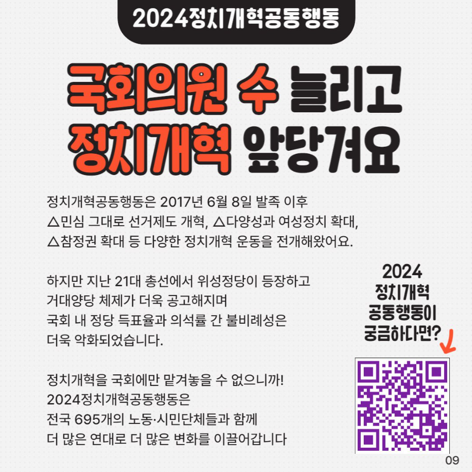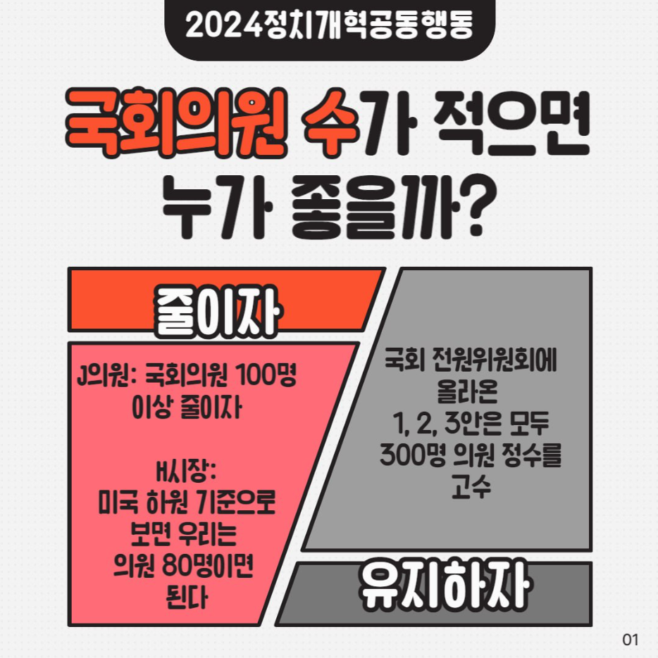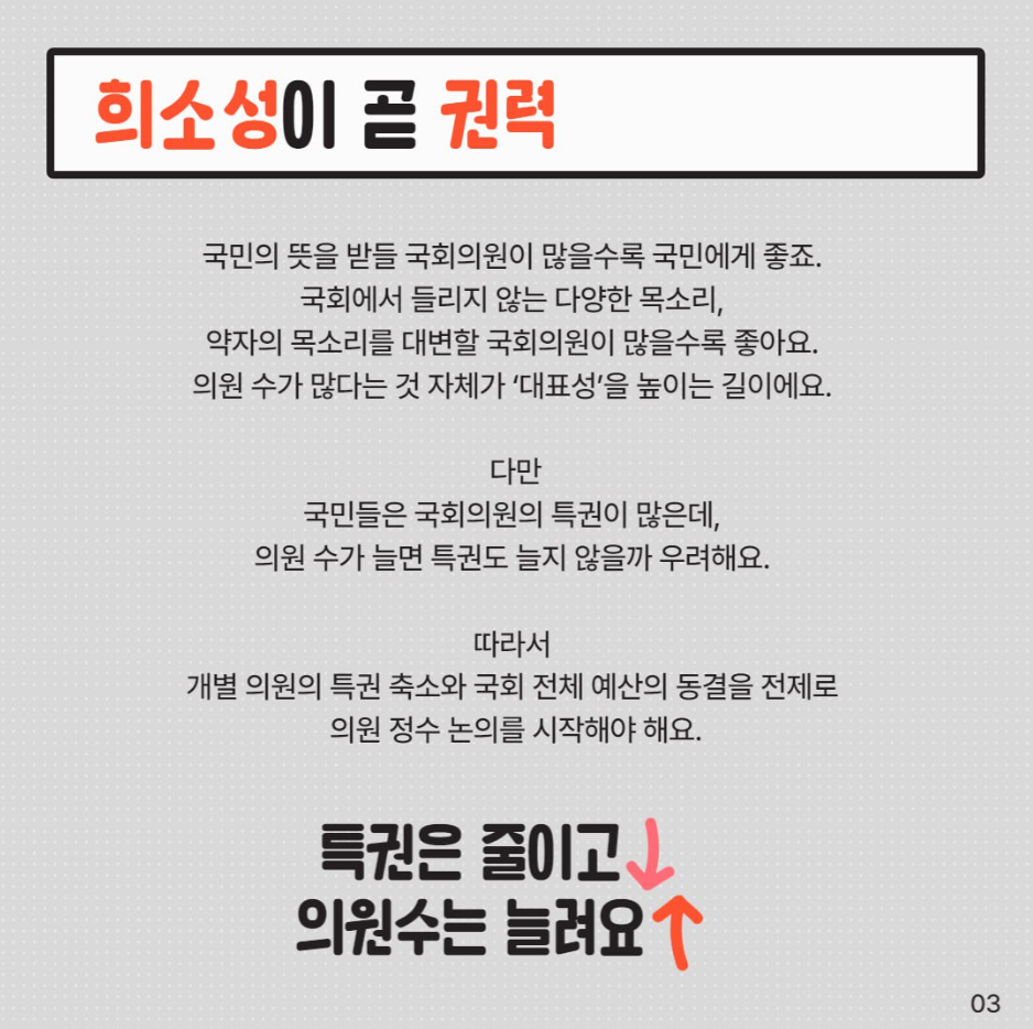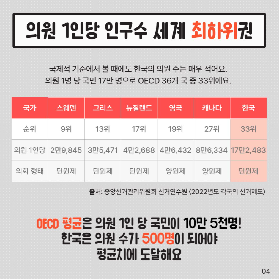 구체적으로 한국의 국회의원 1면당 인구수가 세계 최하위권 이라는 통계를 제시하며, 설득력있는 근거를 제시하고 있습니다. 아래는 참여연대의 게시물 이미지 입니다. 국회의원 수를 왜 늘려야 되는지 잘 정리되어 있습니다.