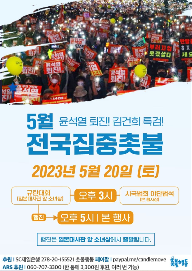 오는 5월20일 윤석열 퇴진을 외치는 전국단위 집회가 열릴 예정입니다. 윤석열 정부가 출범한지 약 1년여가 흐른 지금 윤석열 정부에 대한 국민들의 분노가 들끓고 있습니다. 본 집회에서 국민들은 윤정부의 불통과 오만을 비판하고 정권퇴진을 요구할 것으로 보입니다.