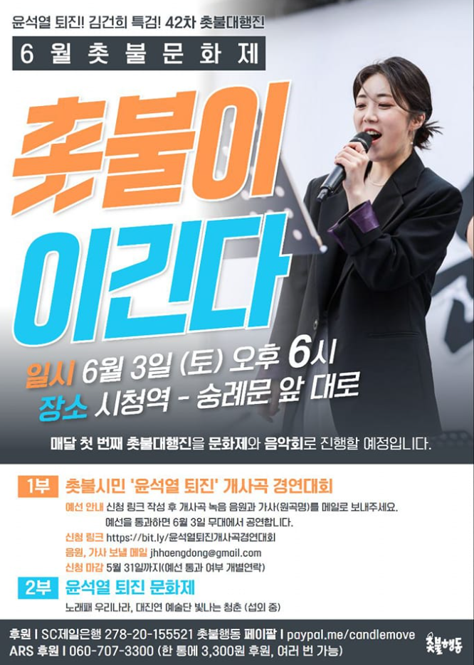 각종 참사와 무능으로 국민들의 분노를 사고 있는 윤석열 정부의 퇴진을 촉구하는 촛불 문화제가 6월3일 열립니다. 최근 대학교수들과 종교계의 시국선언이 잇따라 발표되며, 정권 퇴진을 부르짖는 목소리가 커져가고 있습니다. 민생에 도무지 관심이 없는 정권을 국민들은 용납하지 않을 것입니다.
