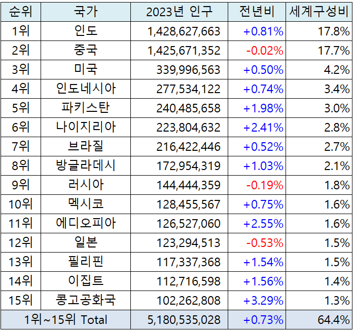 2023년 전세계 인구는 약 80억4천만명 정도로 추산됩니다. 전세계 인구중 인구1억 이상을 보유한 15개국의 인구 비중은 약 64.4%를 차지합니다. 1억이상 15개국의 총 인구수는 약 52억명 정도 입니다.