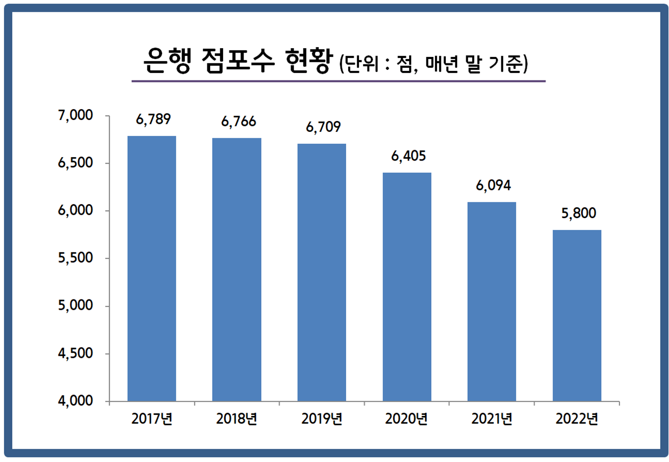 우리나라의 최근 5년간 은행 점포수는 989개가 감소하였습니다. 무려 14.6%가 감소한 것입니다. 특히, 대부분의 감소는 코로나 직후인 최근 3년사이 이루어졌습니다. 코로나가 '온라인쉬프트'를 가속화 시켰으나, 이전부터 점포수 감소 추세는 나타나고 있었습니다. 이러한 추세는 당분간 지속될 것으로 전망됩니다.