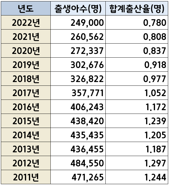 1970년대 초 100만명 수준이던 출생아수는 2022년 24만9천명을 기록함으로써, 우리나라의 년도별 출생아 수는 50여년만에 4분의1 수준으로 감소하였습니다. 합계출산율 역시 2018년 부터 1명 이하로 하락했고, 2022년에는 0.78명을 기록하고 있습니다.