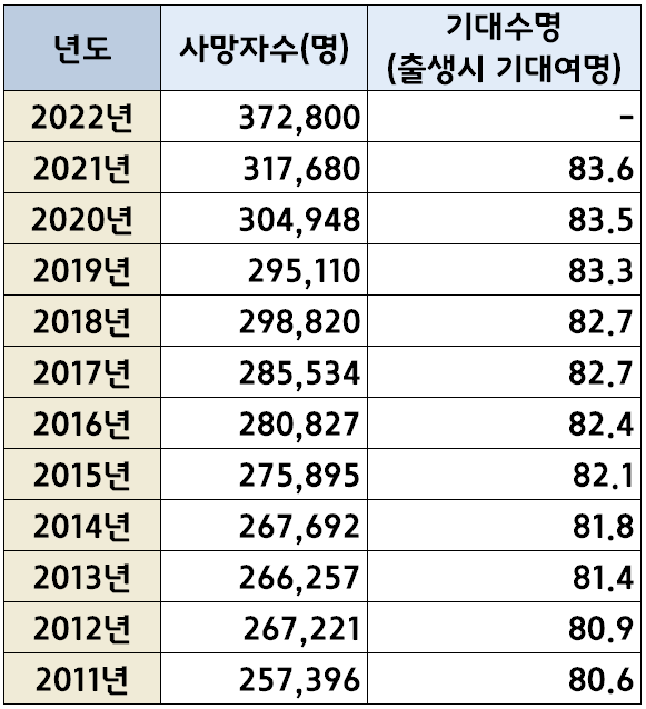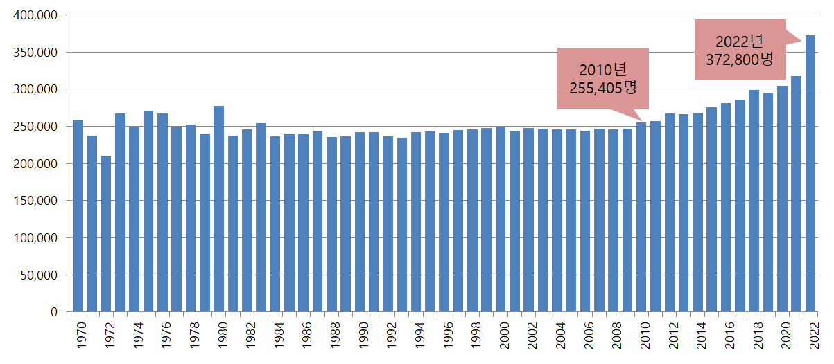 우리나라 사망자수는 1970년 258,589명 이었으며, 이후 2010년 까지 약 40여년간 25만명 수준을 유지하였습니다. 그러나 2010년 이후 최근까지 약 10여년간 증가세가 두드러지게 나타나고 있습니다. 2022년 사망자 수는 372,800명 수준으로 2010년 대비 46% 증가하였습니다.