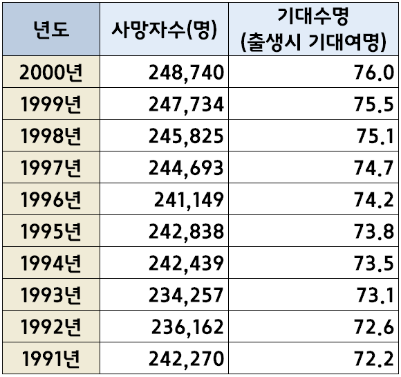 한국 년도별 사망자 수(1970년~2022년) 본문