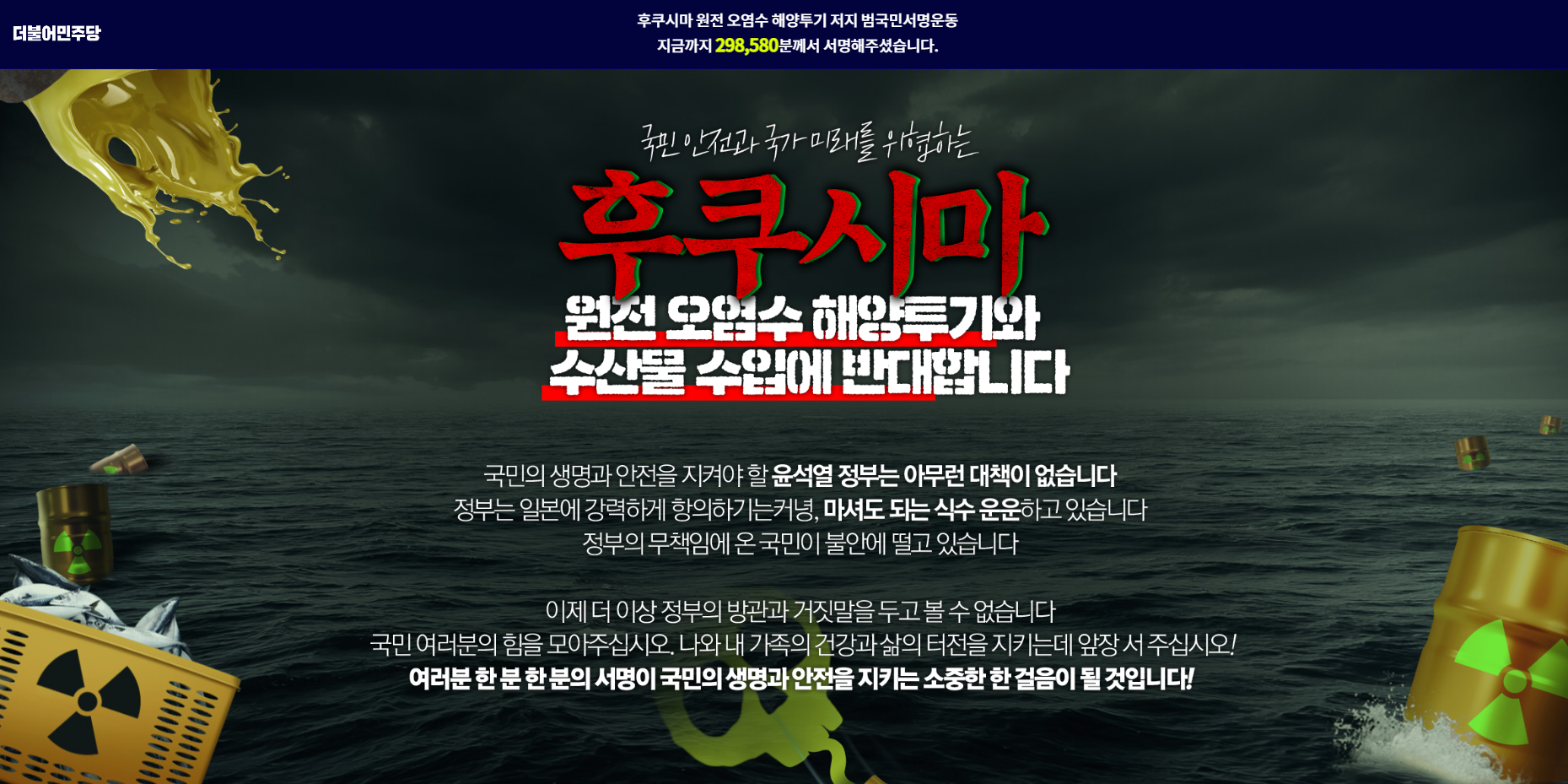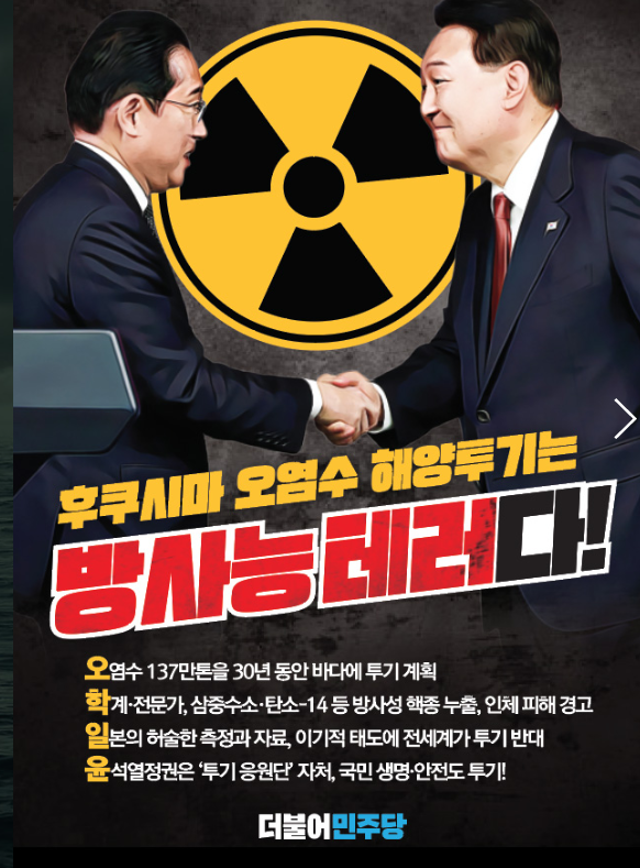 더불어민주당은 일본의 '후쿠시마 오염수 해양투기는 방사능테러' 라며 격렬하게 비판하며, 국민의 생명과 안전을 위해 힘쓰고 있습니다. 민주당은 후쿠시마 원전오염수 해양투기 반대를 위한 서명운동을 전개함과 동시에, 반대 집회를 열어 일본의 이러한 행동을 강력하게 규탄하고 있습니다. 또한 이에 대한 윤석열 정권의 부실한 대응 역시 강도높게 비판하고 있습니다. 아래는 민주당의 관련 활동 이미지 입니다.