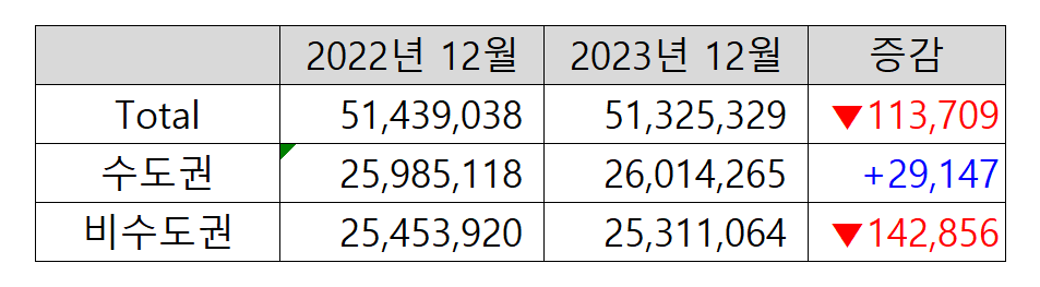 2023년 한해동안 수도권(서울,경기,인천)의 인구집중은 더욱 심화된 것으로 나타났습니다. 행정안전부 주민등록 통계에 따르면, 지난 한해 우리나라 총인구 감소 추세 속에서도, 수도권의 인구는 늘어난 것으로 파악 되었습니다. 2022년 12월 기준 수도권 인구는 총 25,985,118명 이었으나, 2023년 12월 26,014,265명으로 증가하였습니다. 1년만에 29,147명이 증가한 것입니다. 반면, 같은기간 비수도권 인구는 142,856명 감소했습니다. 수도권과 비수도권 인구 증감이 뚜렸한 대조를 보이고 있습니다.