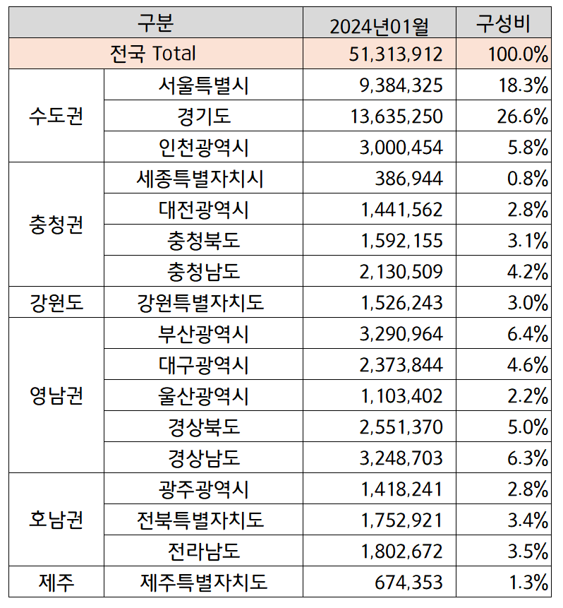 2024년 우리나라 시도별 인구현황에 대해 알아보겠습니다. 본 글은 2024년 1월부로 업데이트 된 행정안전부 주민등록인구통계 데이터를 기반으로 작성하였습니다.